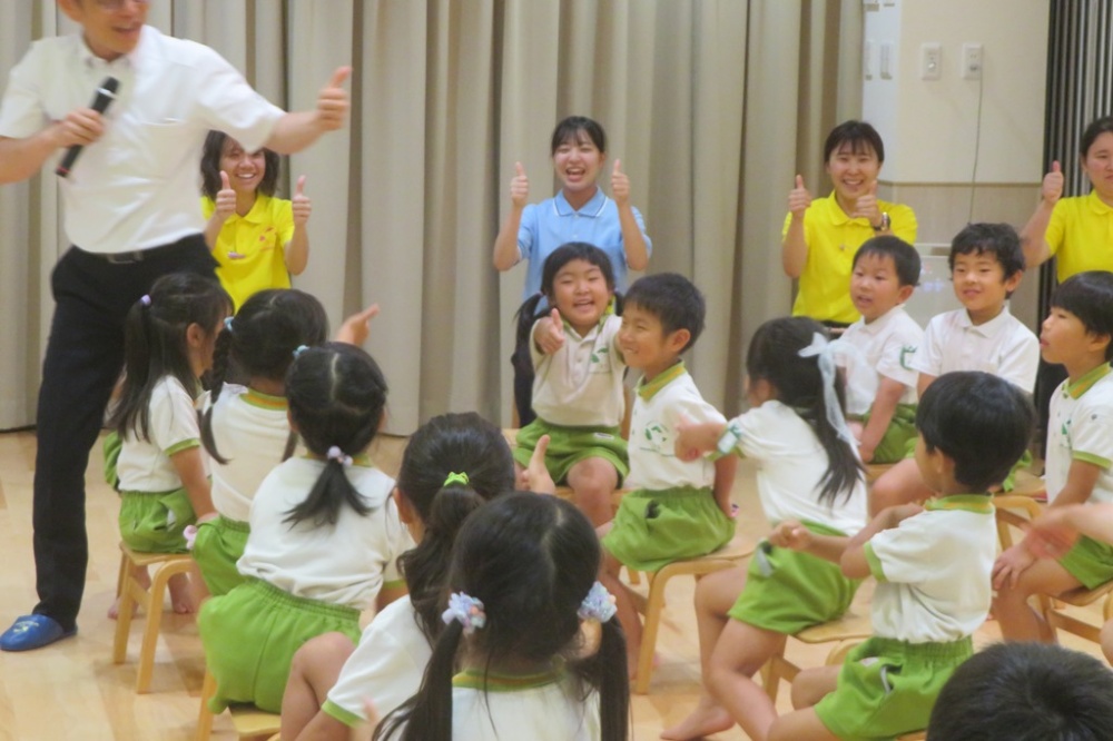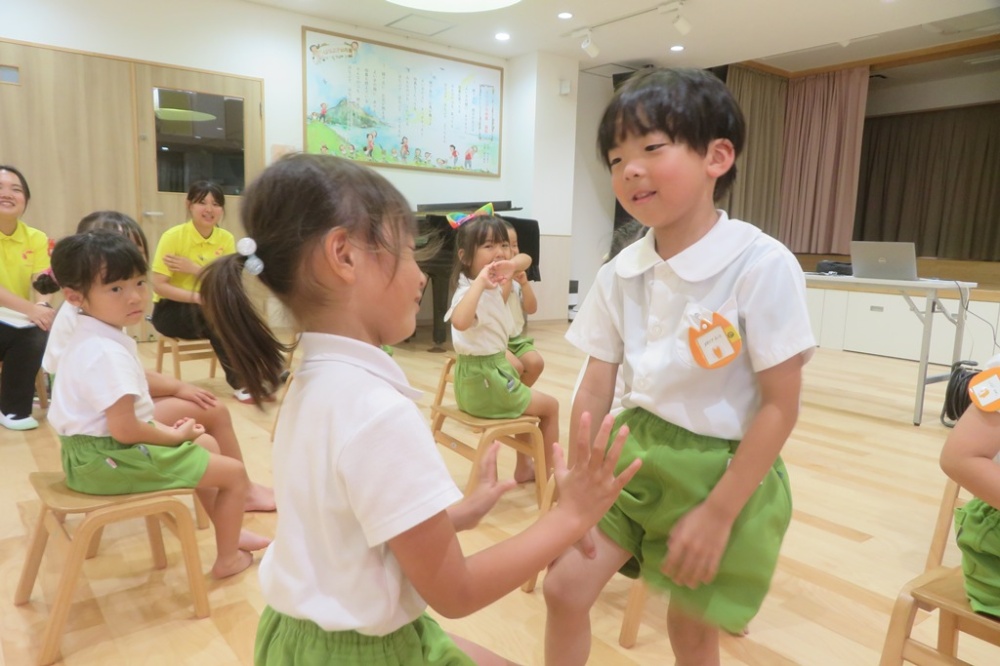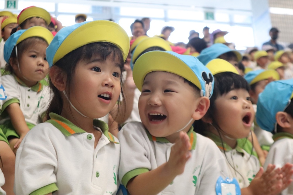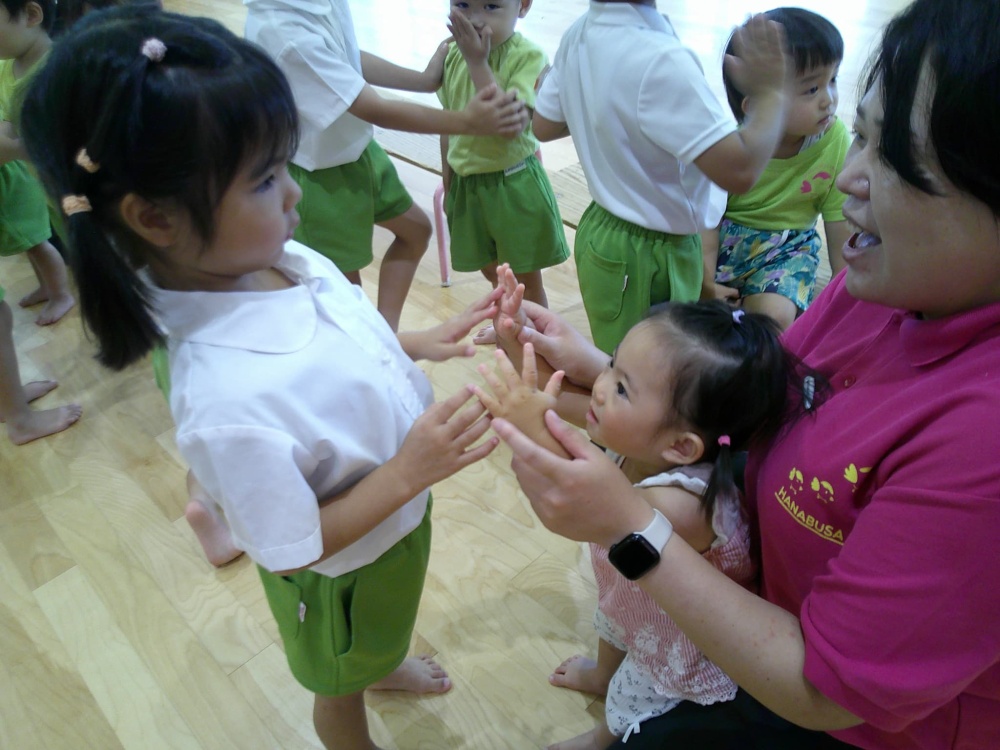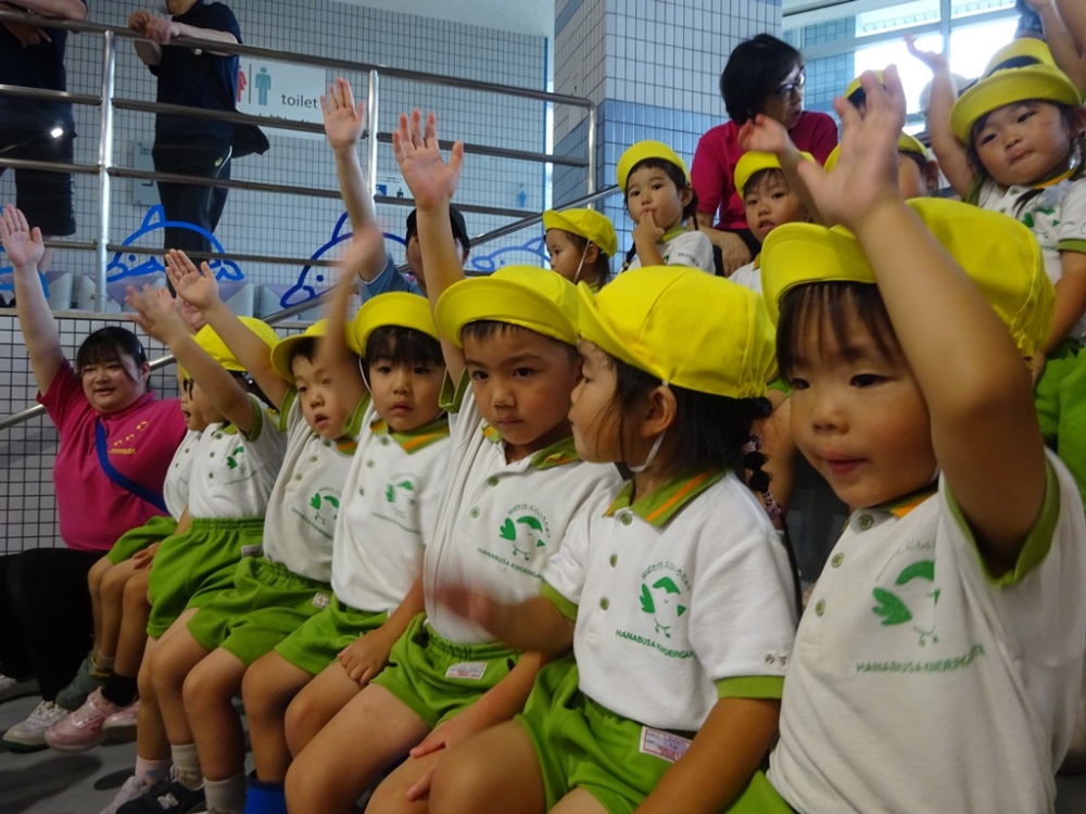 よ~く見ると子どもたちに負けじと手を挙げる先生たち!さすがはなぶさ幼稚園!
